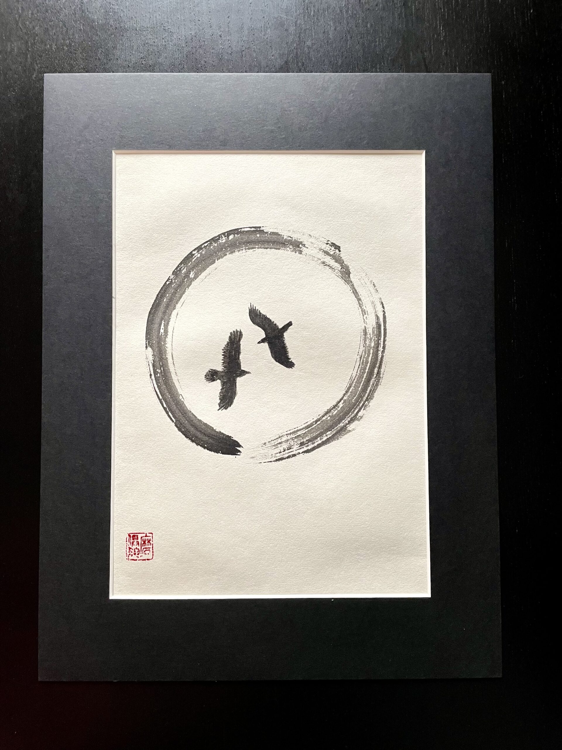 Czarne słońce i kruki, obraz malowany tuszem na papierze ryżowym w technice sumi-e, wymiary z passe partout 30 x 40 cm