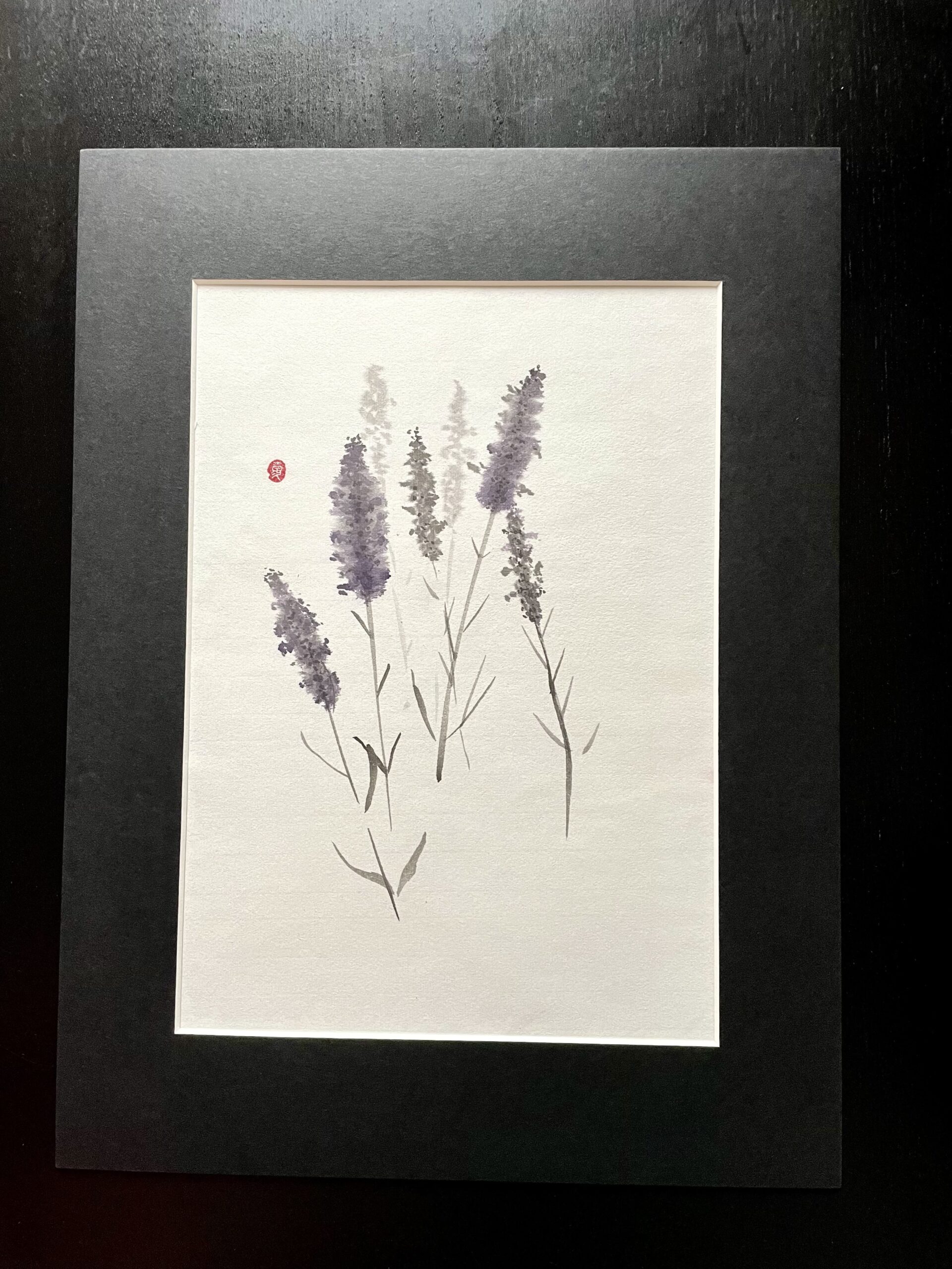 Pole lawendy, obraz malowany tuszem na papierze ryżowym w technice sumi-e, wymiary z passe partout 30 x 40 cm