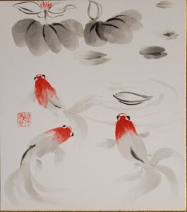 Obraz przedstawiający wesołe rybki igrajace pod powierzchnią wody. Malowany tuszem japońskim na specjalnym podobraziu z papieru japońskiego. Gotowe do postawienia na półce lub oprawy